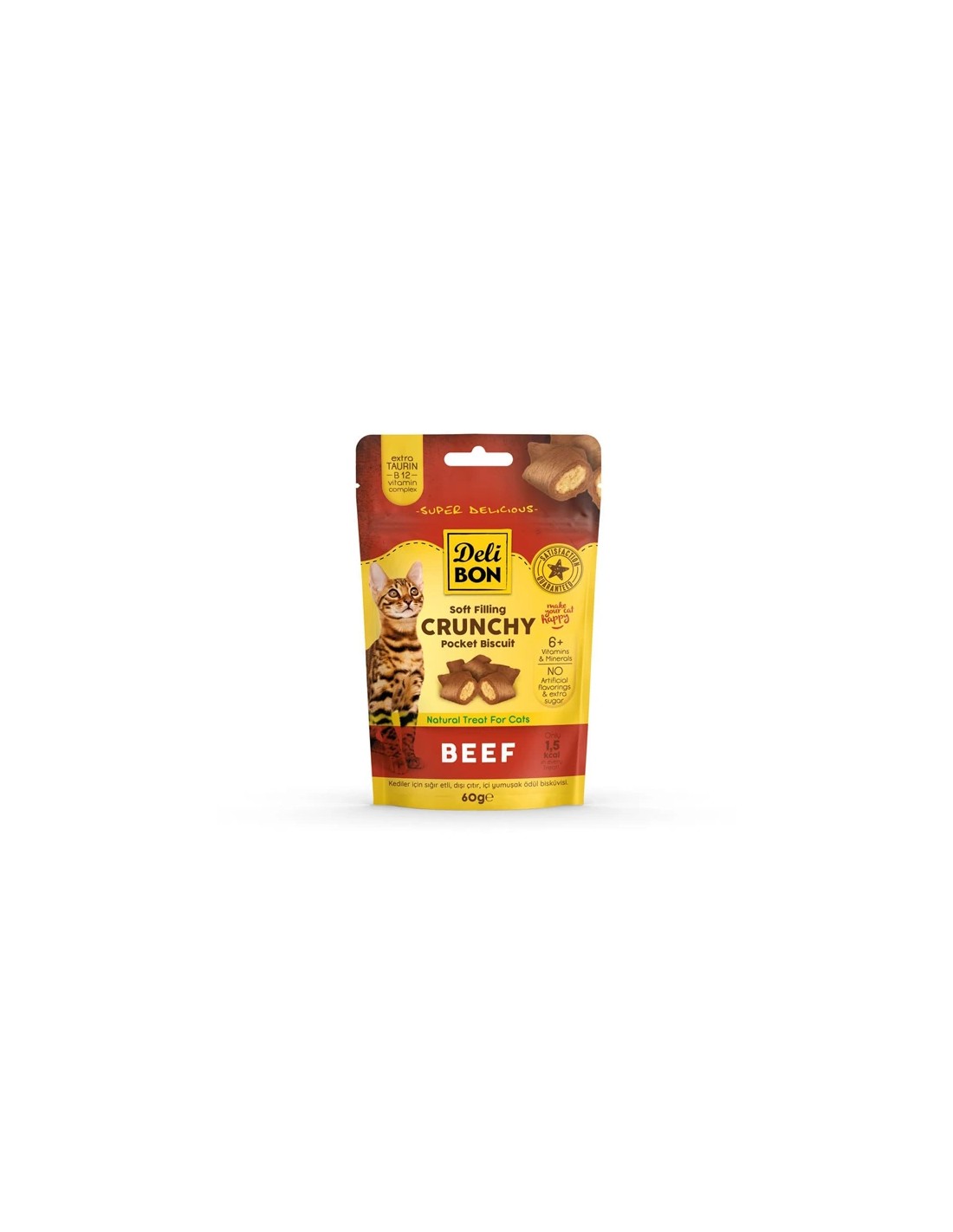 Kedinizin ödül saatlerini daha lezzetli ve keyifli hale getiren Delibon Crunchy İçi Dolgulu Bisküvi, içerdiği sığır eti aroması ile öne çıkan özel bir atıştırmalıktır. Dışı çıtır çıtır, içi ise yumuşak ve dolgulu olan bu lezzet, kedinizin damak zevkine hitap ederken aynı zamanda ağız ve diş sağlığını destekler. Nane içeriği sayesinde ferah bir nefes sunarken, tavuk aroması kedinizin ilgisini çekecek doğal bir tat sağlar.