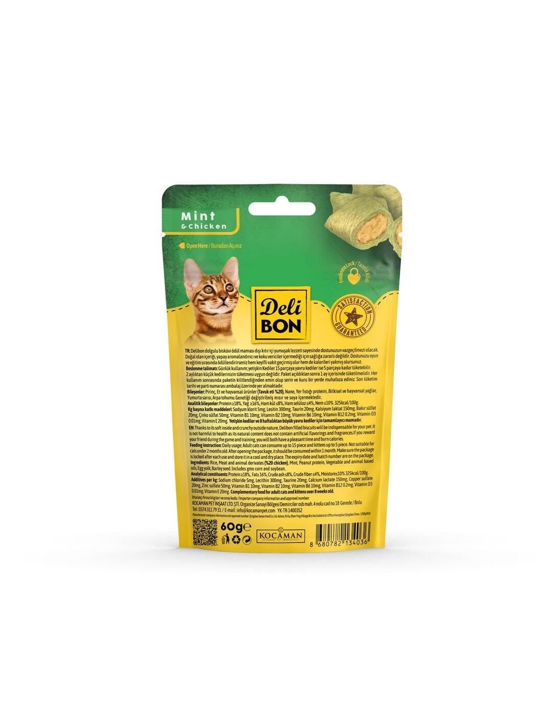 Kedinizin ödül saatlerini daha lezzetli ve keyifli hale getiren Delibon Crunchy İçi Dolgulu Bisküvi, tavuk ve nane aromasıyla öne çıkan özel bir atıştırmalıktır. Dışı çıtır çıtır, içi ise yumuşak ve dolgulu olan bu lezzet, kedinizin damak zevkine hitap ederken aynı zamanda ağız ve diş sağlığını destekler. Nane içeriği sayesinde ferah bir nefes sunarken, tavuk aroması kedinizin ilgisini çekecek doğal bir tat sağlar.