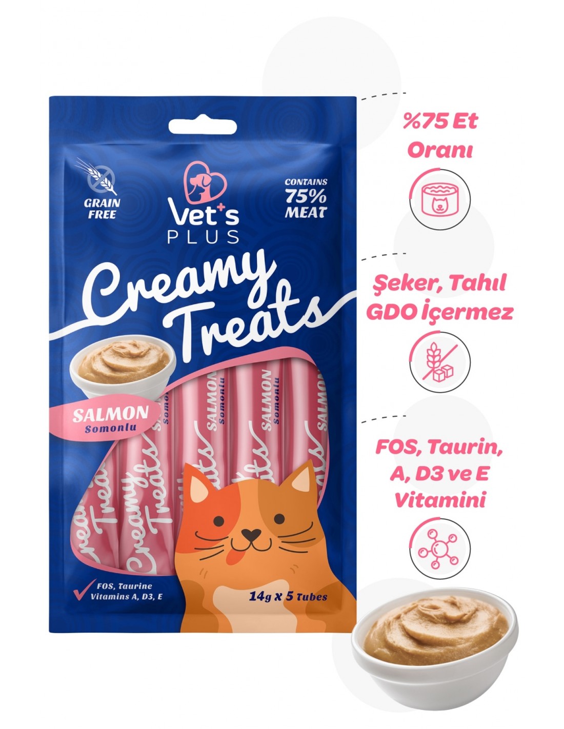 Vet's Plus Creamy Treats Somonlu, kediniz için lezzetli ve besleyici bir ödül atıştırmalığıdır. Kremsi yapısıyla kolayca tüketilebilen bu ödül maması, özellikle seçici kediler için ideal bir atıştırmalıktır. İçeriğindeki kaliteli somon proteini, kedinizin bağışıklık sistemini desteklerken tüy ve deri sağlığını da korumaya yardımcı olur.