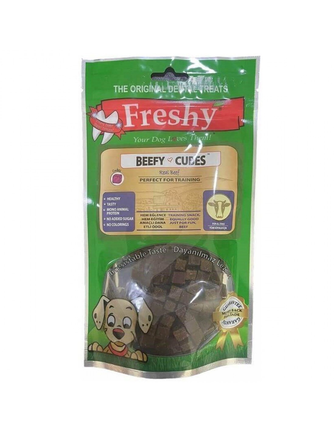 Köpeğinizin sağlıklı ve mutlu bir yaşam sürmesine katkıda bulunun; Freshy Beefy Cubes Biftekli Küpler Köpek Ödülü ile ona hak ettiği lezzeti sunun!