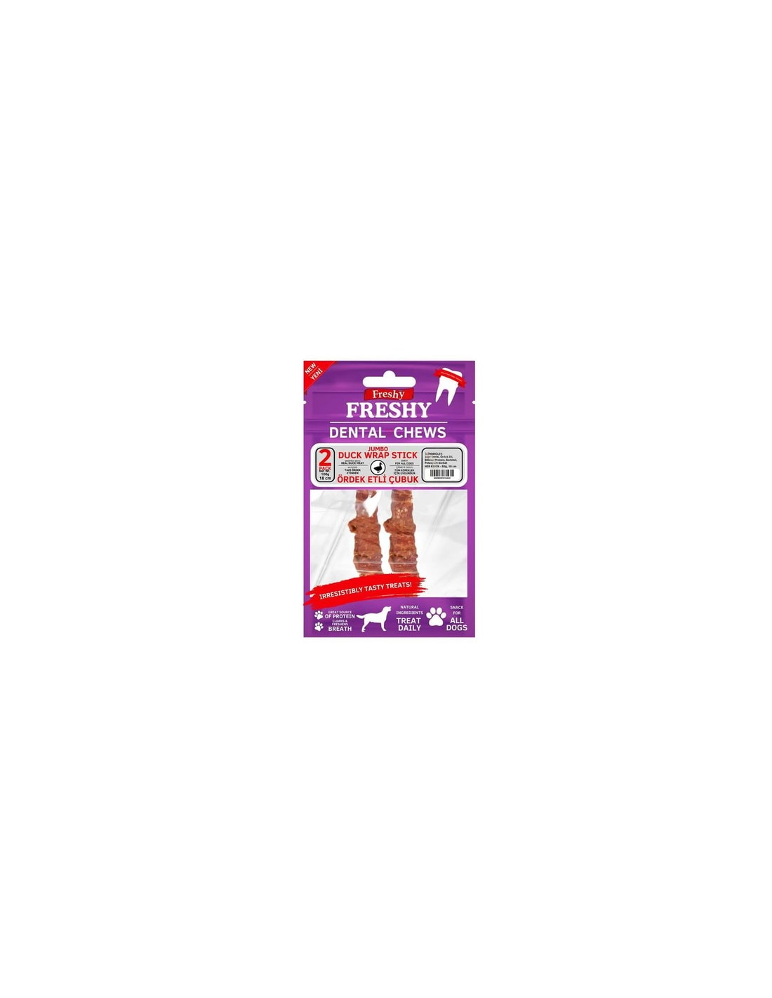 Köpeğinizin diş sağlığını desteklerken ona lezzetli bir çiğneme deneyimi sunmak için Freshy Dental Chews Duck Wrap Stick Ördek Sarılı Jumbo Çubuk Köpek Ödülü 100 gr (2 Adet 18 cm) ideal bir tercihtir. Bu özel çubuklar, gerçek ördek etiyle sarılmış ve sığır derisiyle kaplanmış olup, köpeğinizin çiğneme ihtiyaçlarını karşılayarak diş ve diş eti sağlığını korumaya yardımcı olur.