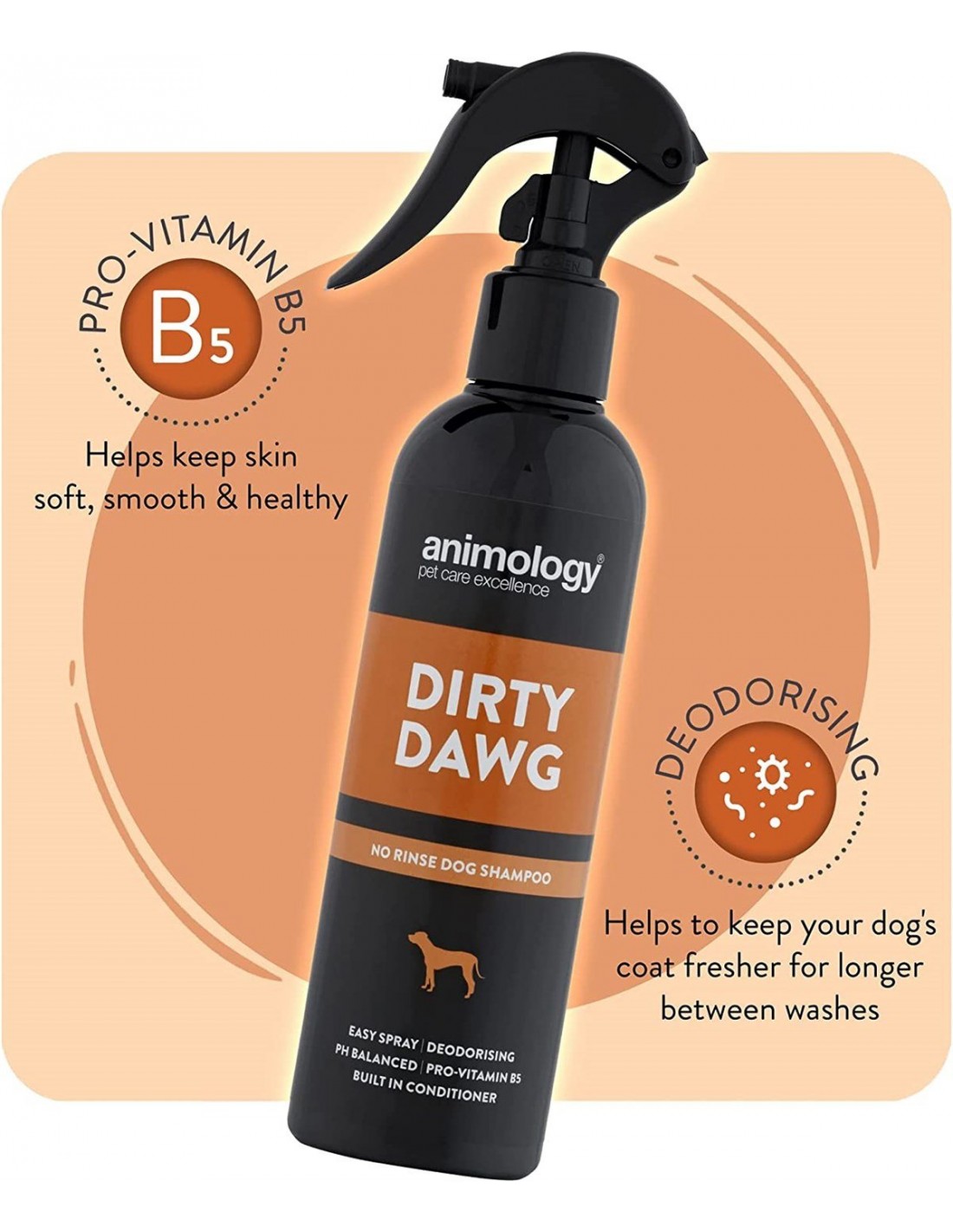 Animology Dirty Dawg Durulanmayan Köpek Şampuanı Spreyi, köpeğinizin tüylerinden kir ve kötü kokuları etkili bir şekilde temizlemeye yardımcı olan hafif, pratik bir sprey üründür. Özellikle koku ve kir giderici özellikleri ile yıkama sırasında ya da yıkamalar arasında hızlı ve kolay temizlik sağlamak için idealdir. Hareket halindeyken bile kullanabileceğiniz bu sprey, köpeğinizin tüylerinin temiz ve taze kalmasını sağlar. Sadece kürküne püskürtüp, tarayarak temizlik işlemini tamamlayabilirsiniz.
